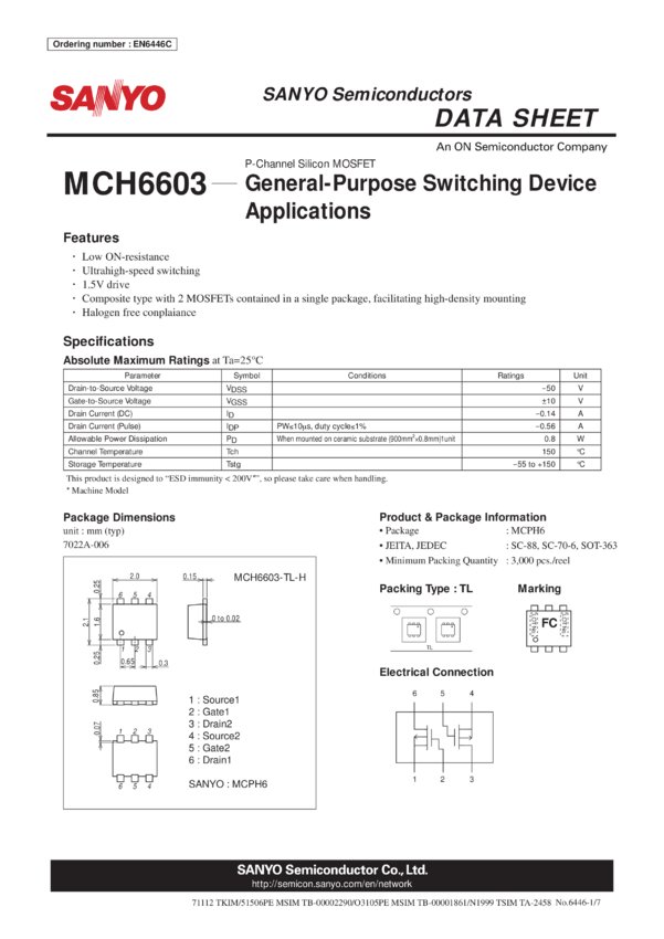 MCH6603 Small Signal MOSFET -50V -140mA 23 Ohm Dual P-Channel MCPH6