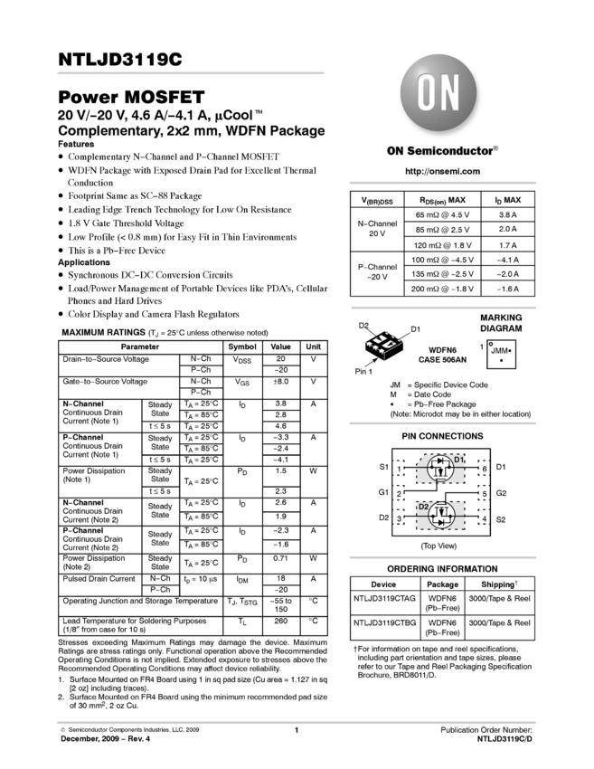 NTLJD3119C Power MOSFET 20V 4.6A 65 mOhm Complementary WDFN6
