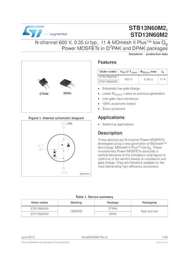 STD13N60M2 N-channel 600 V, 0.35 Ohm typ., 11 A MDmesh II Plus(TM) low Qg Power MOSFET...