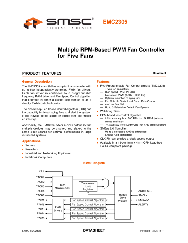 EMC2305 Multiple RPM-Based PWM Fan Controller for Five Fans Data Sheet (05/18/2011)
