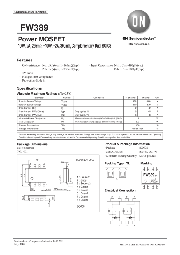 FW389 Power MOSFET, 100V, 2A, 225mOhm, -100V, -2A, 300mOhm, Complementary Dual SO...