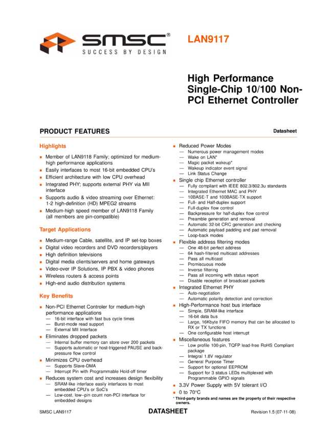 LAN9117 High-Performance Single-Chip 10/100 Non-PCI Ethernet Controller Data Sh (07/11/2008)