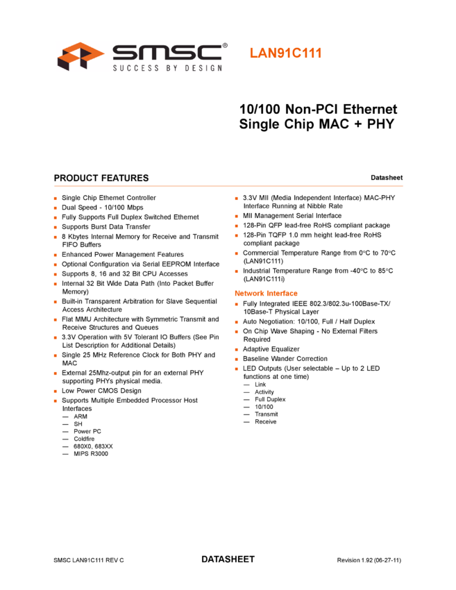 LAN91C111 10/100 Non-PCI Ethernet Single Chip MAC + PHY Data Sheet (06/27/2011)