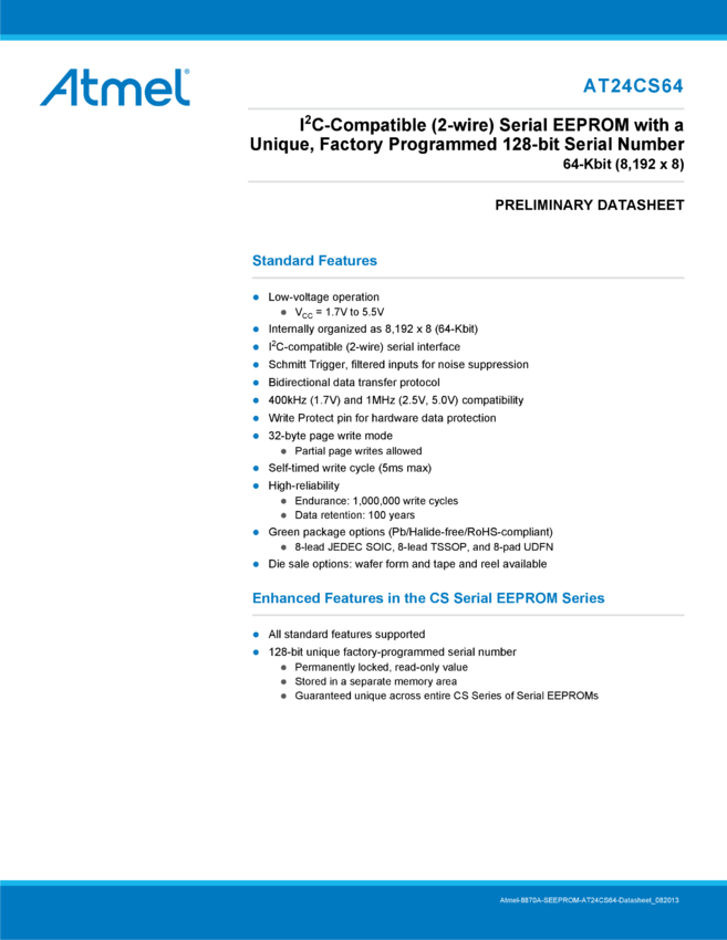 AT24CS64 64Kb I²C-compatible 2-wire Serial EEPROM with 128-bit serial number