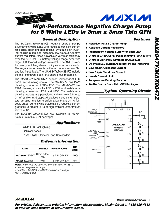 MAX8847Y MAX8847Y, MAX8847Z High-Performance Negative Charge Pump for 6 White LEDs i...