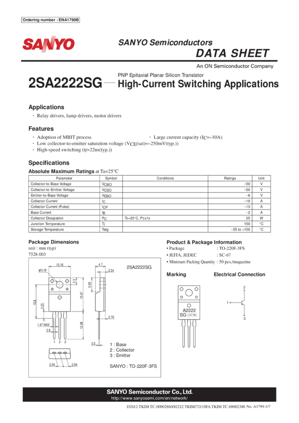 2SA2222SG Bipolar Transistor 50V 10A VCE(sat);500mV max. PNP Single TO-220F-3FS