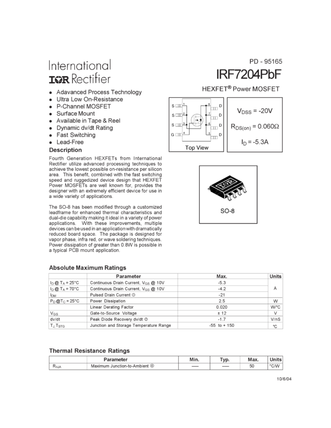 IRF7204PBF Tranzystor P-MOSFET, 5.3A, 20V, Rds=0.06, SO8
