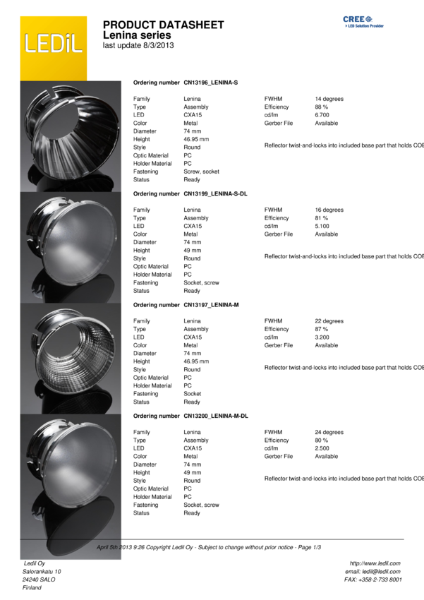Reflektor LENINA-W-13198, Wide, 40&deg, do diod LED High Power CREE seria CX15, średnica 74mm, Ledil