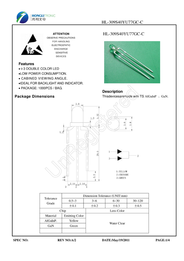 Dioda LED, 3mm, , żółty 590nm, 600mCd, zielony: 520nm, 4400 mCd; trójnóżkowa, wspólna katoda; water clear, 30 stopni, Honglitronic