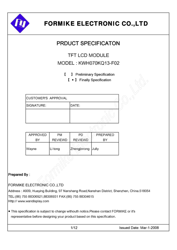 TFTF070D-TP Panel TFT , 152.4x91.44mmmm , 800xRGBx480 pikseli, podświetlenie białe LED