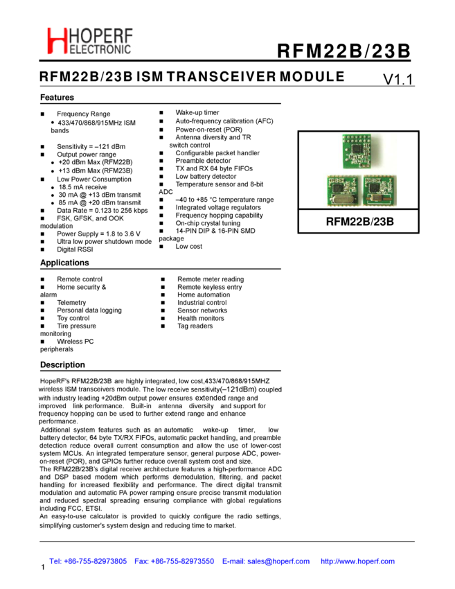 RFM22B-433S2 Transceiver [nadajnik-odbiornik] RF 433 MHz FSK, SMD, -121/20 dBm, 16 x 16...