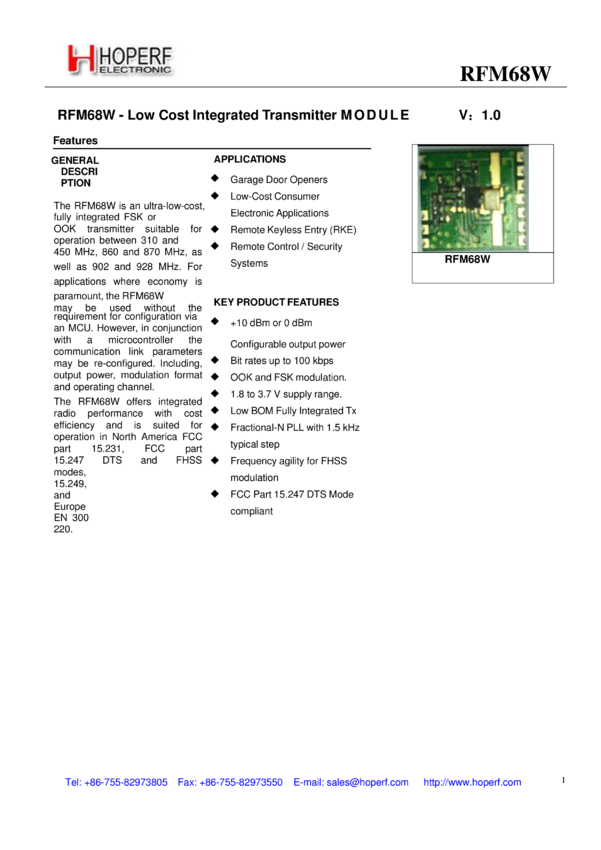 RFM68W-433S2 Nadajnik RF 433 MHz FSK, SMD, moc 10 dBm, 14.5 x 15 x 1.7 mm