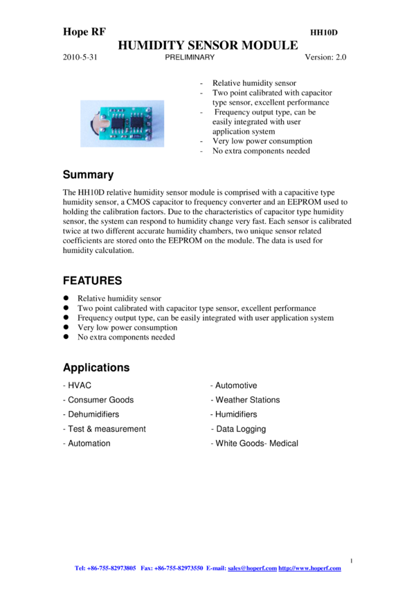 Moduł czujnika wilgotności względnej HH10D, częstotliwościowy sygnał wyjściowy, dokładność pomiaru 3%, zakres 0-99%, rozdzielczość 0,08%, Hope RF