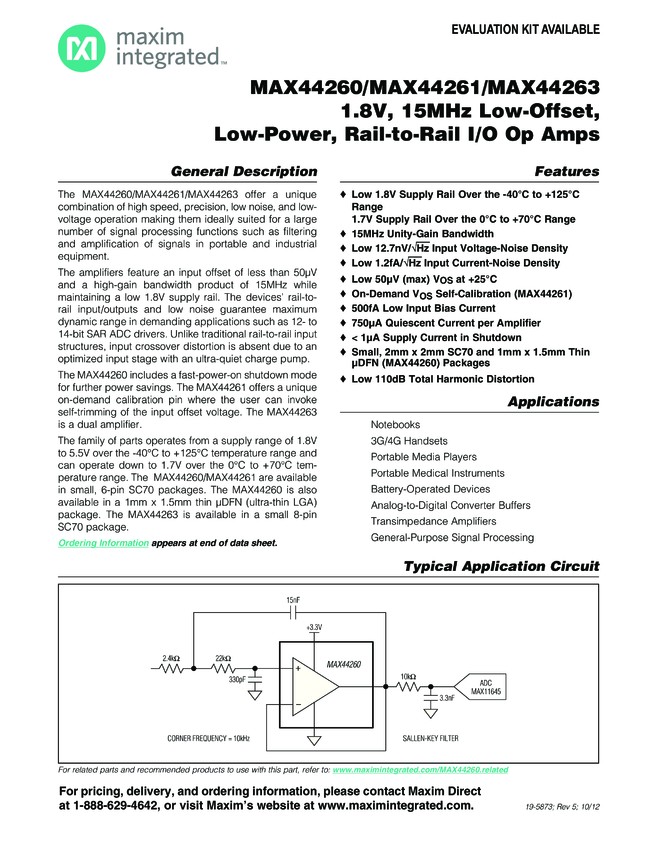 MAX44260 MAX44260, MAX44261, MAX44263 1.8V, 15MHz Low-Offset, Low-Power, Rail-to-Rai...