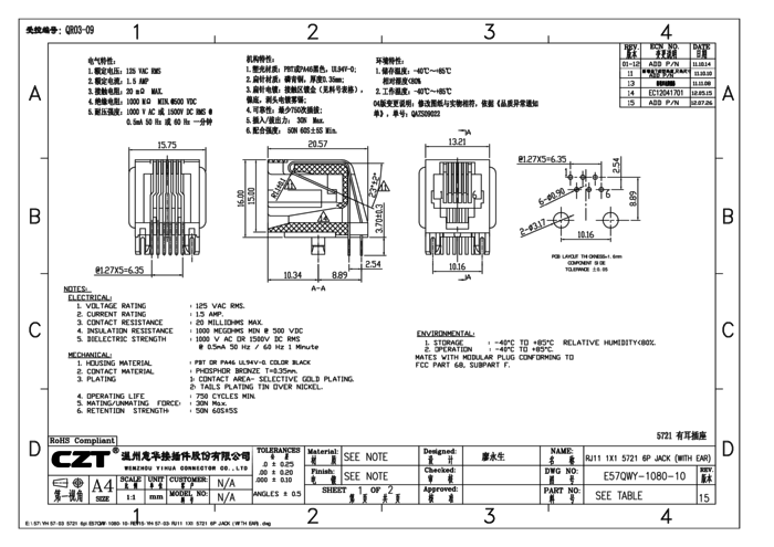 TJACK6P6C03-LF Gniazdo , 6-stykowe, gabaryt 6, styki 3μ" Au