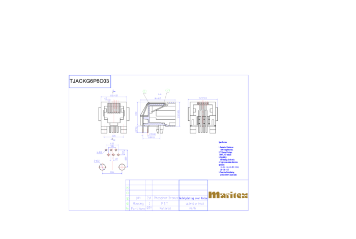 TJACKG6P6C03-LF Gniazdo , 6-stykowe, gabaryt 6, styki 3μ" Au
