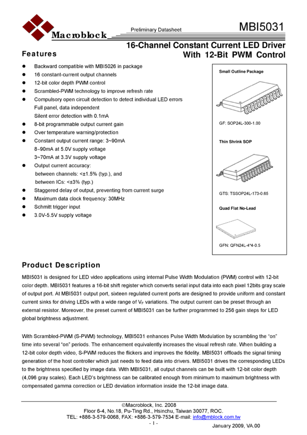 MBI5031GF-C 16-kanałowy PWM LED driver, 12-bitowa głębia koloru, 5-60mA/3.3V, 5-80mA/5V...