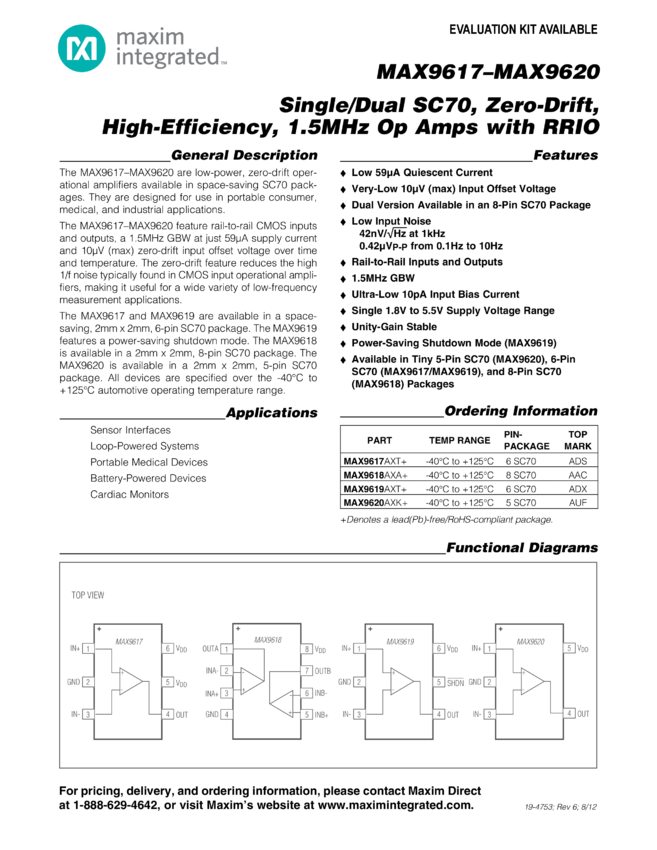 MAX9617 MAX9617, MAX9618, MAX9619, MAX9620 High-Efficiency, 1.5MHz Op Amps with RRI...