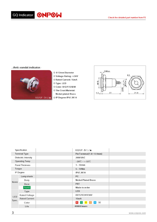 SW-GQ12FDB12 Lampka sygnalizacyjna, metalowa, 12mm, , LED 12V, IP67, CE