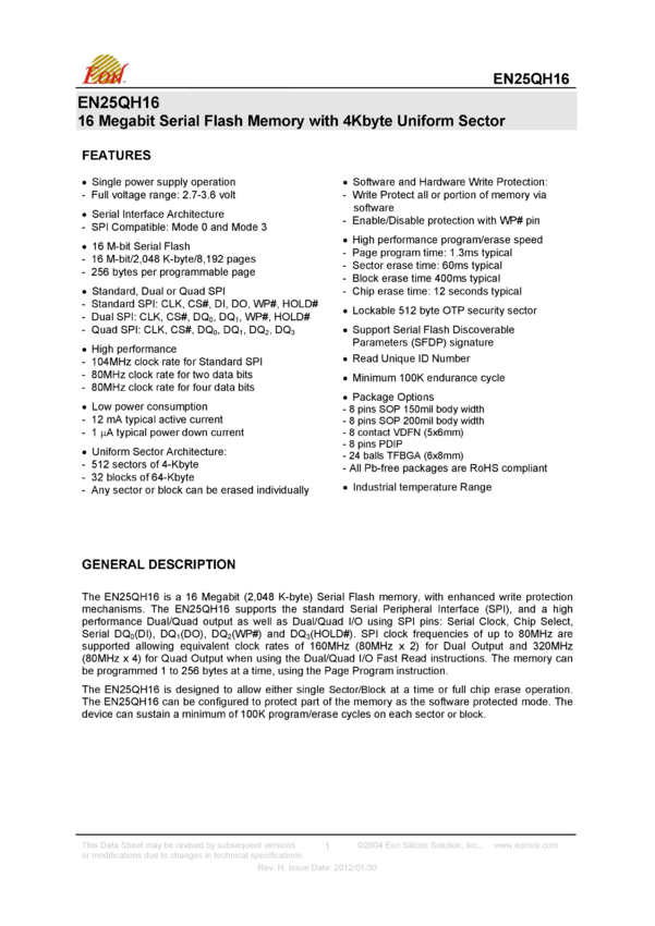EN25QH16 Pamięć szeregowa Flash SPI, , 3.0V, 104MHz, SOP8 150mil, zastępuje pamięć E...