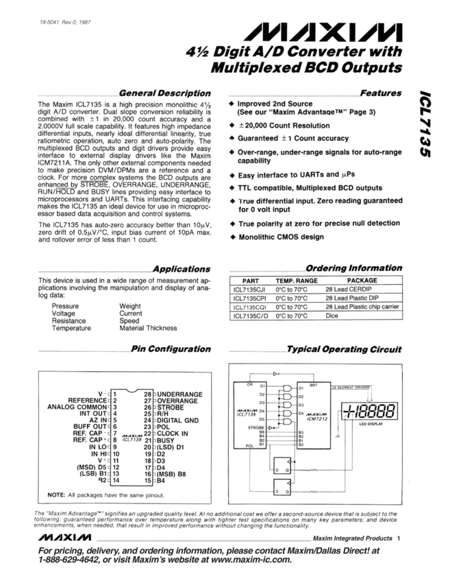 ICL7135 Przetwornik A/C, 4 i 1/2 cyfry, wyjścia multipleksowane BCD, DIL28