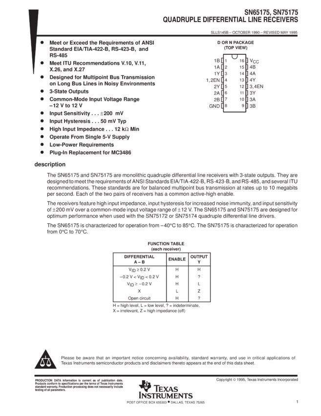 SN75175 4 x odbiornik linii, zgodny z RS422B, RS423B i RS485, DIL16
