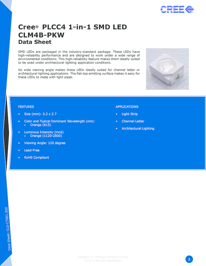LED CREE CLM4B-PKW PLCC4, , 50mA, 3.2x2.8mm, selekcja CXaXbBB3 /1800-2800 mCd; PB/, 120 stopni, ROHS