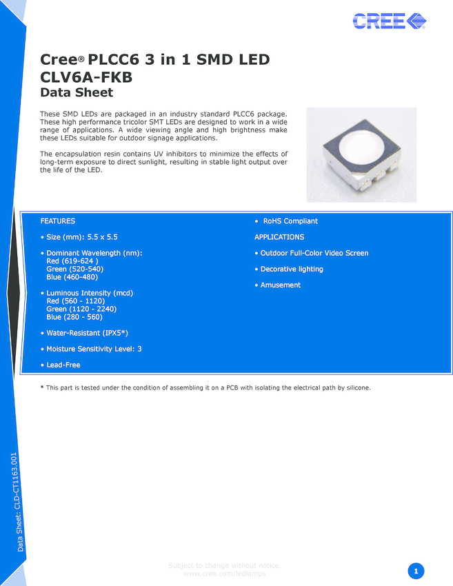 LED CREE CLV6A-FKB PLCC6, , 3x20mA, 5.5x5.5mm, , selekcja:CM1Q1H1BB7R3R3/Red: 710-1120mCd; Green: 1400-2240mCd; Blue 350-560mCd/, ROHS