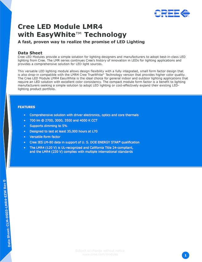 LMR040-0700-30F8-20100EW, Moduł firmy CREE, Technologia EasyWhite™, barwa - , Colour Correlated Temperature (CCT): ; Luminous Flux @ Test:700lm , napięcie zasilające:230V, Moc:12W