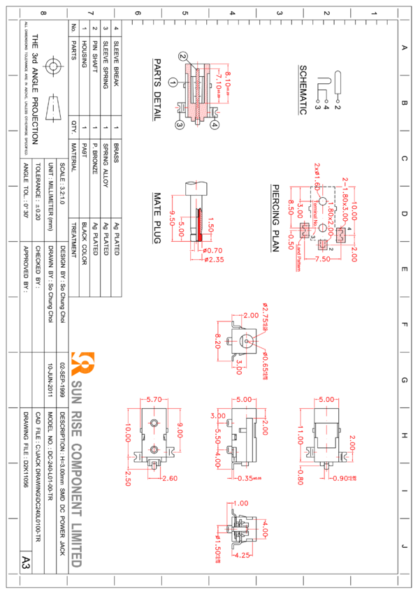 DC065SMTA Gniazdo męskie z kołkiem Ø0.65 mm, otwór DØ2.75 mm