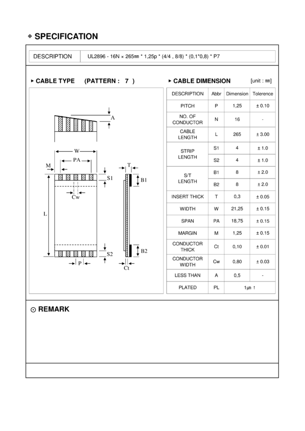 FFC1.25X16X255XC Taśma 16-ścieżkowa, C, L=265mm, U=30V, temp. pracy 80°C, UL2896