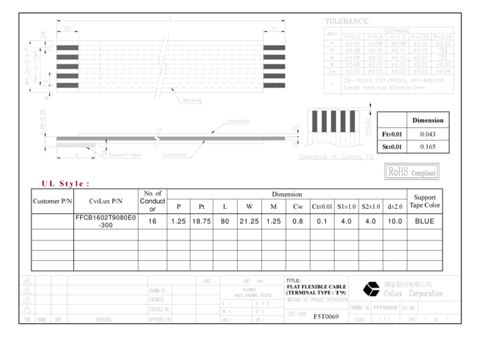 FFC1.25X16X70XB Taśma 16-ścieżkowa, B, L=80mm, U=60V, temp. pracy 105°C, UL20706