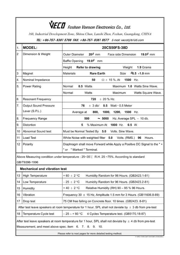 VEC-20CS50FS-38ND Głośnik Ultra Small, 50Ω, 500mW, 500Hz-5kHz, fr=720Hz, D=20mm, h=3.0mm