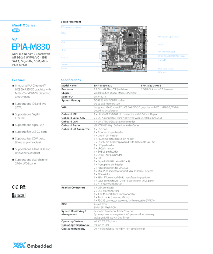EPIA-M830-10VE Płyta główna Mini-ITX VIA EPIA M830-10VE, bezwiatrakowa, 1.0GHz Nano-E CPU,...