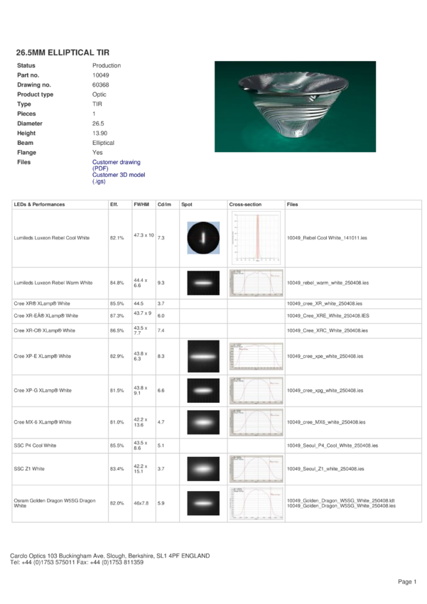 Soczewka Carclo, 10049, eliptyczna, do diod Cree serii XR, XP, MX-6, XM-L, XB-D, XT-E, śr: 26,5mm, wys:13,9mm, FWHM(XP-E):43,8&deg x 6,3° FWHM(XP-G):43,8&deg x 9,1&deg