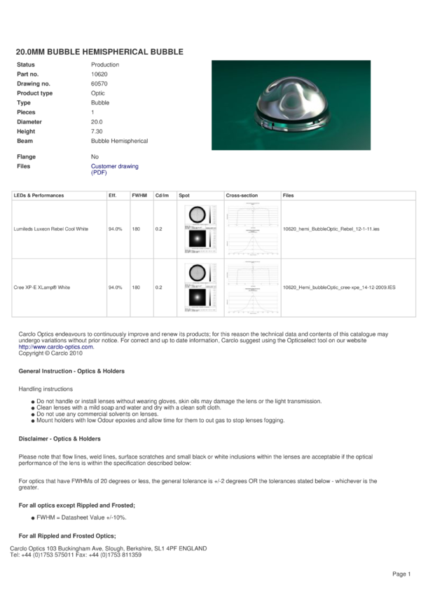 Soczewka Carclo 10620, jednolita, hemi- sferyczna, optyka typu Bubble, do diod Cree serii XP-E, ś: 20mm, wys:7,3mm, FWHM(XP-E):180&deg