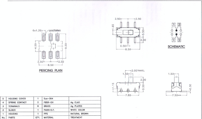Miniaturowy przełącznik suwakowy, pionowy, 2-biegowy typu 2C, do montażu SMT