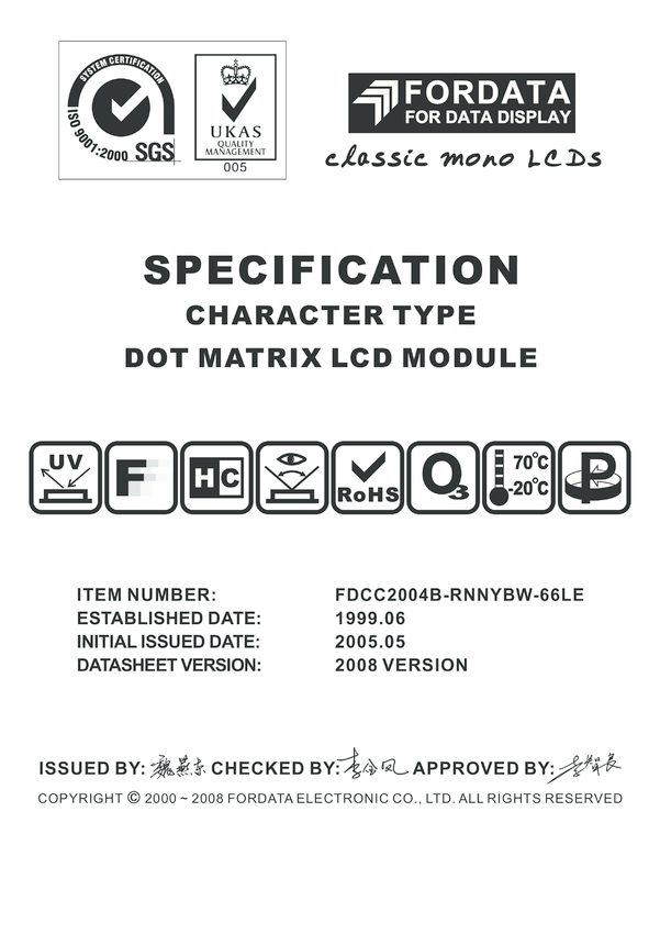Matryca 20x4 znaków, pozytywowa, , żółto-zielone tło STN, z filtrem UV, 06:00, -20/+70C, ekran , Font English-Japanese, FORDATA [FDCC2004B-RNNYBW-66LE]