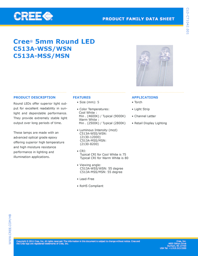 LEDU-C513A-WSN-CREE Dioda LED, 5mm, , ultrajasna 2130-8200 mCd, water clear, 55 stopni, Cree