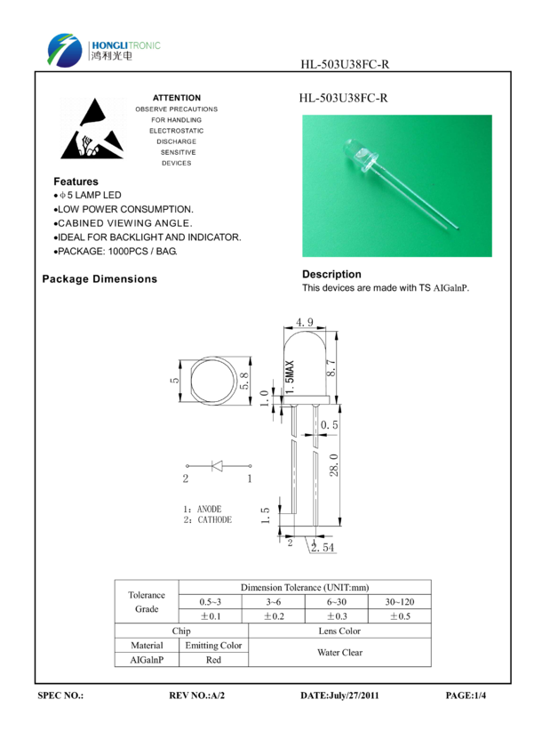 Dioda LED, 5mm, , 625 nm, ultrajasna 18000 mCd, water clear, 15 stopni, Honglitronic