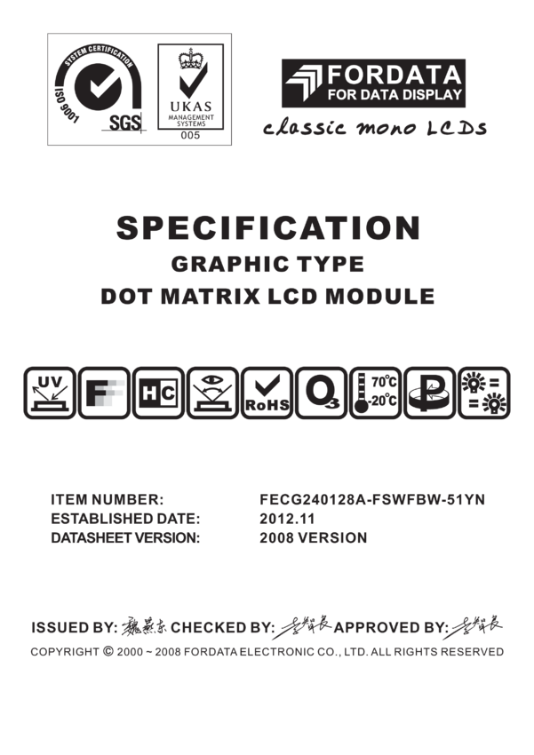 Matryca graficzna , pozytywowa, z podświetleniem , z filtrem UV, 06:00, -20/+70C, ekran , FORDATA [FECG240128A-FSWFBW-51TN]