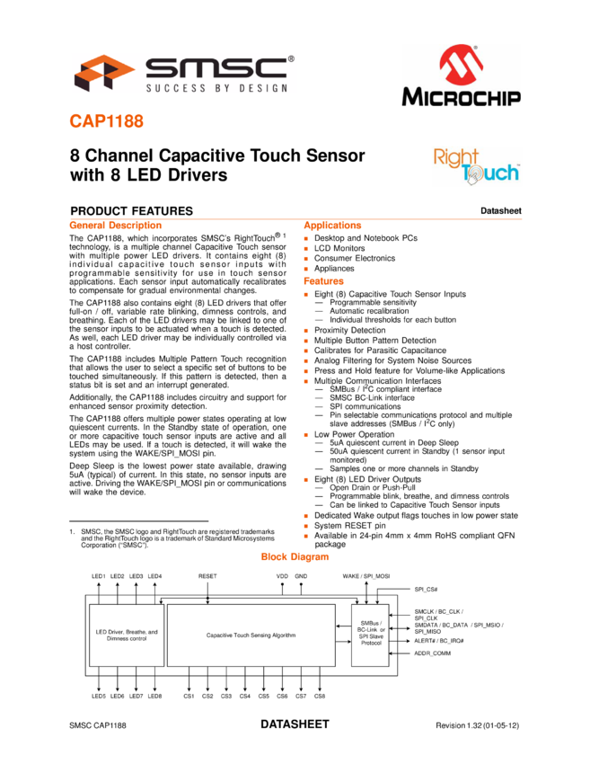 CAP1188 8 Channel Capacitive Touch Sensor with 8 LED Drivers Data Sheet (01/05/2012)