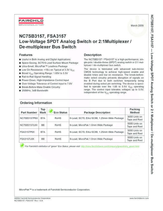 NC7SB3157P6X Przełącznik analogowy SPDT, SC70-6