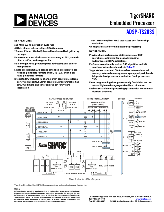 ADSP-TS203S 500 MHz TigerSHARC Processor with 4 Mbit on-chip embedded DRAM