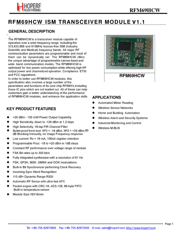 Transceiver RF 433 MHz FSK, SMD, -120/20 dBm, 16 x 16 mm, kompatybilny pin-pin z transceiverem RFM23B-868