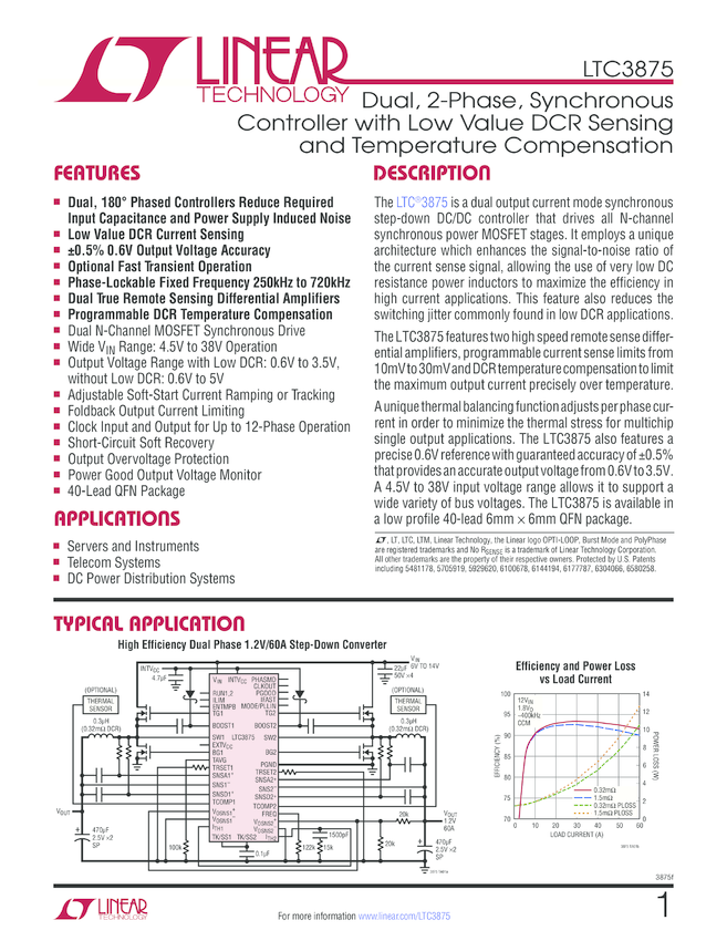 LTC3875 Dual, 2-Phase, Synchronous Controller with Low Value DCR Sensing and Temper...