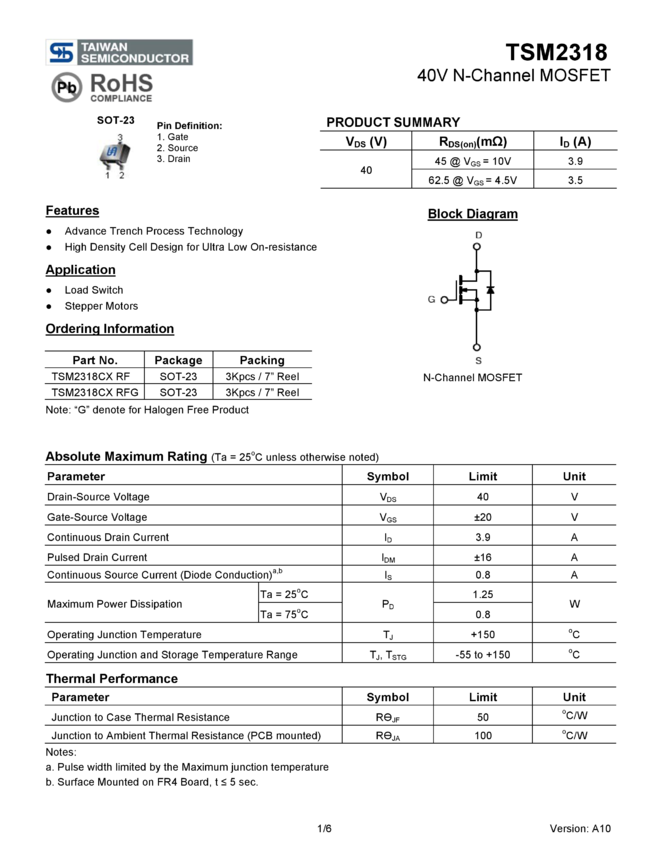 TSM2318CX Tranzystor N-MOSFET, 3.9A, 40V, SOT23, zamiennik dla SI2318CDS (Vishay)
