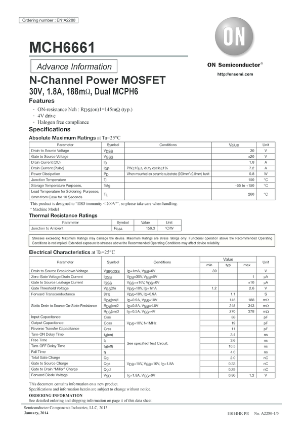 MCH6661 N-Channel Power MOSFET, 30V, 1.8A, 188mΩ, Dual MCPH6
