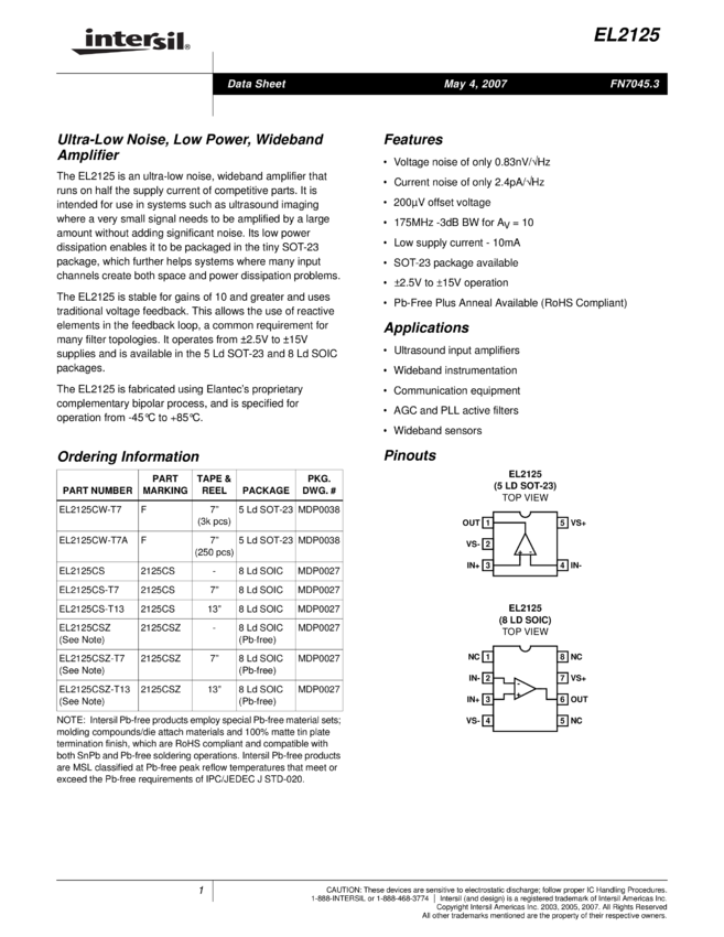 EL2125 Ultra-Low Noise, Low Power, Wideband Amplifier