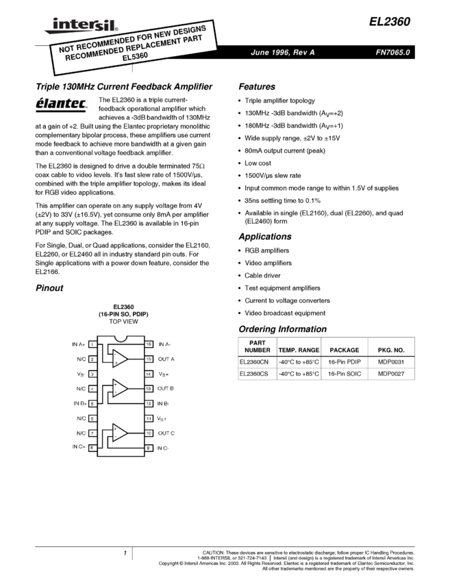 EL2360 Triple 130MHz Current Feedback Amplifier